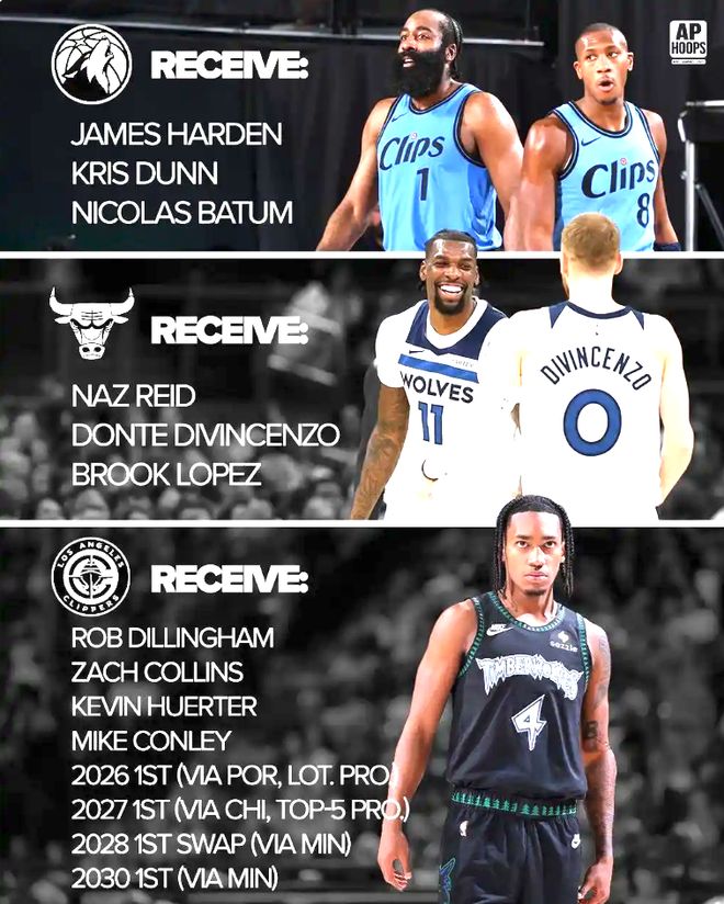 美媒爆史诗级3方交易方案,森林狼追哈登组四巨头,快船彻底重建